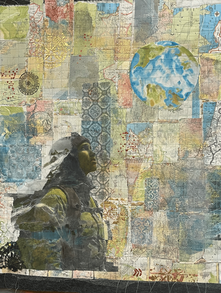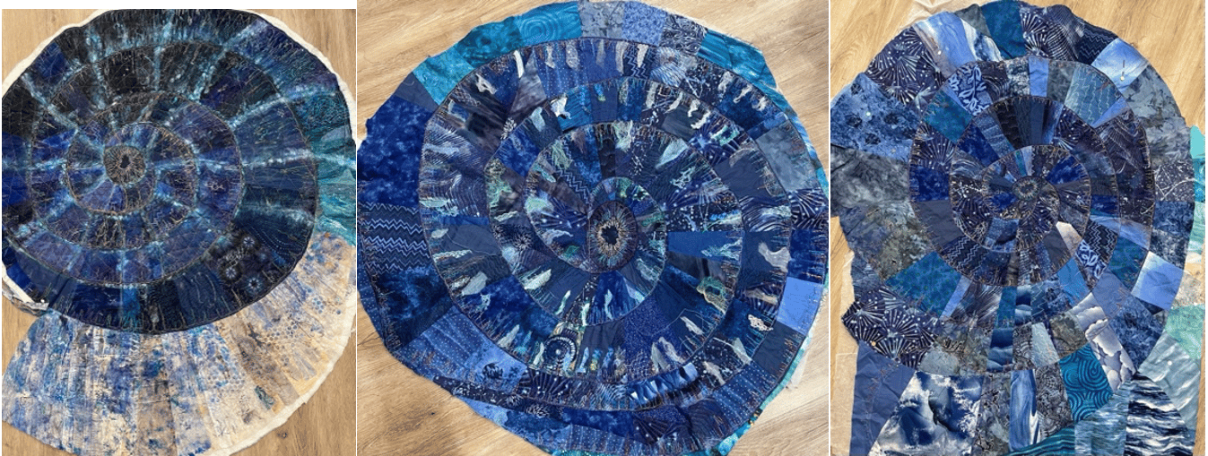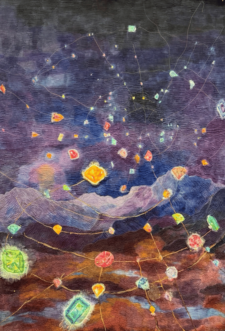 Behind the Scenes Quilt being blocked booked Quilt after drying “Dissolving into Wholeness” With Neptune in my 12th astrological house, I feel deeply connected to the unseen—dreams, intuition, and collective emotion. In my archetypal wheel, The Healer resides in this house also, guiding me through the realms of the unseen and the sacred creating opportunities to explore moving from Separation to Wholeness. "I used over 125 thread colors, changing threads roughly every five minutes, and logged...