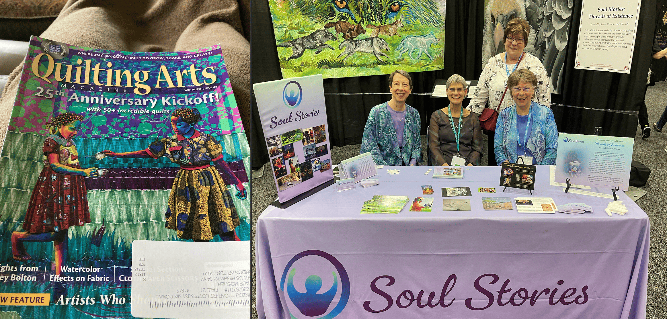 Together, we’ll explore how these archetypes guide not just our art, but our way of being in the world — reminding us that collective patterns have the power to shape individual lives and make a difference for all. December 10, 2025 – 2:00 PM EST The Visionary​ ​Join Zoom Meeting​ (save dates/zoom on your calendar) ​ Soul Stories Update​ If you haven’t yet seen the most recent article in Quilting Arts, I invite you to take a look — it beautifully captures the spirit of Soul Stories, the international textile art collective I founded to explore how myth, meaning, universal issues and personal narrative are expressed through cloth. We debuted our first exhibition in Houston this past October, and the response was extraordinary. Our next stop is the New England Quilt Museum in Lowell, MA, where our work will be on view from April 14 – July 18, 2026, with an artist reception on May 16 at 1:00 PM. From there, Soul Stories travels to the Festival of Quilts in Birmingham, England (July 30 – August 2, 2026), followed by the Rocky Mountain Quilt Museum in Golden, Colorado (April 17 – July 17, 2028). This growing exhibition schedule reflects our shared commitment to creating art that carries personal and collective significance. You can follow our journey and explore the work at SoulStoriesArt.com. ​ The Artist’s Threshold – virtual class​ Saturday, January 10, 2026, 11:00am – 1:00pm ET, $25 ​